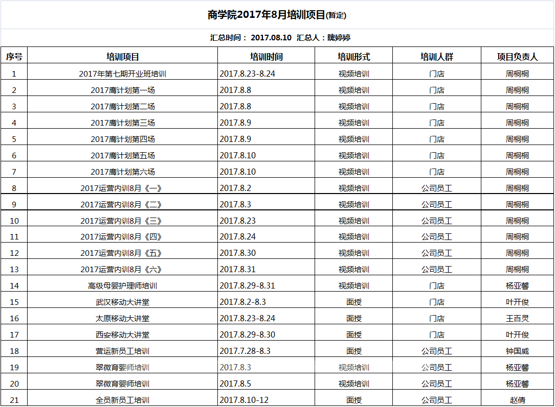 愛親母嬰商學院2017年8月培訓項目